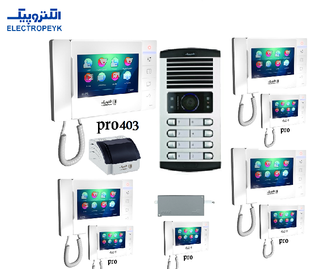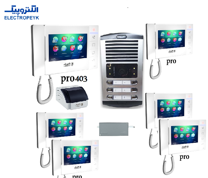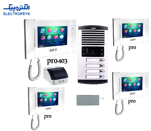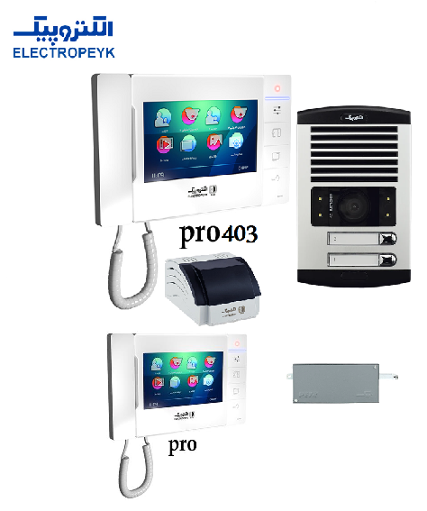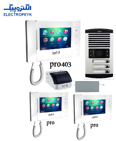 پکیج کامل آیفون تصویری الکتروپیک | مانیتور 7 اینچ Pro403 + پنل 1086 رنگی + قفل زنجیری 671 + منبع تغذیه V1-386